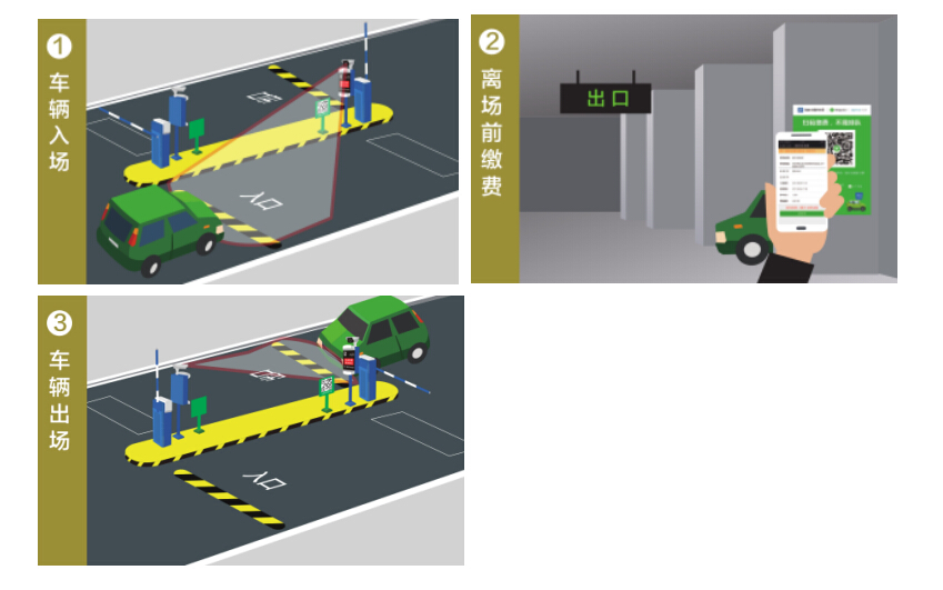 離場(chǎng)前繳費(fèi):微信掃碼場(chǎng)內(nèi)繳費(fèi)二維碼或APP繳費(fèi),完成繳費(fèi)開(kāi)車(chē)出場(chǎng)。